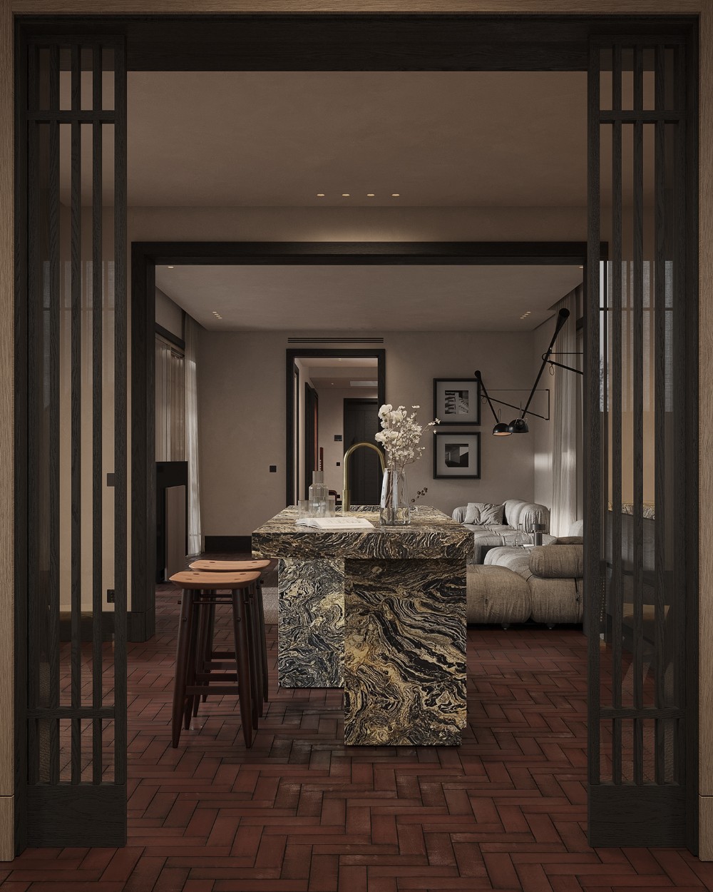 The kitchen is bold but restrained. The stone island becomes a natural focal point, almost sculptural in form. Its rich veining adds contrast against the otherwise quiet palette. Bar seating keeps the space social and informal, making the kitchen feel like part of everyday living rather than a closed-off zone.