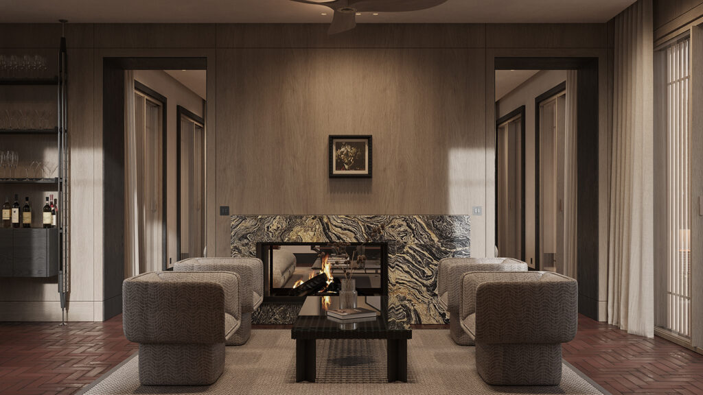 This seating area more intimate than the main living area, yet just as considered. The layout is symmetrical and calm, anchored by the fireplace, which naturally becomes the emotional center of the room.