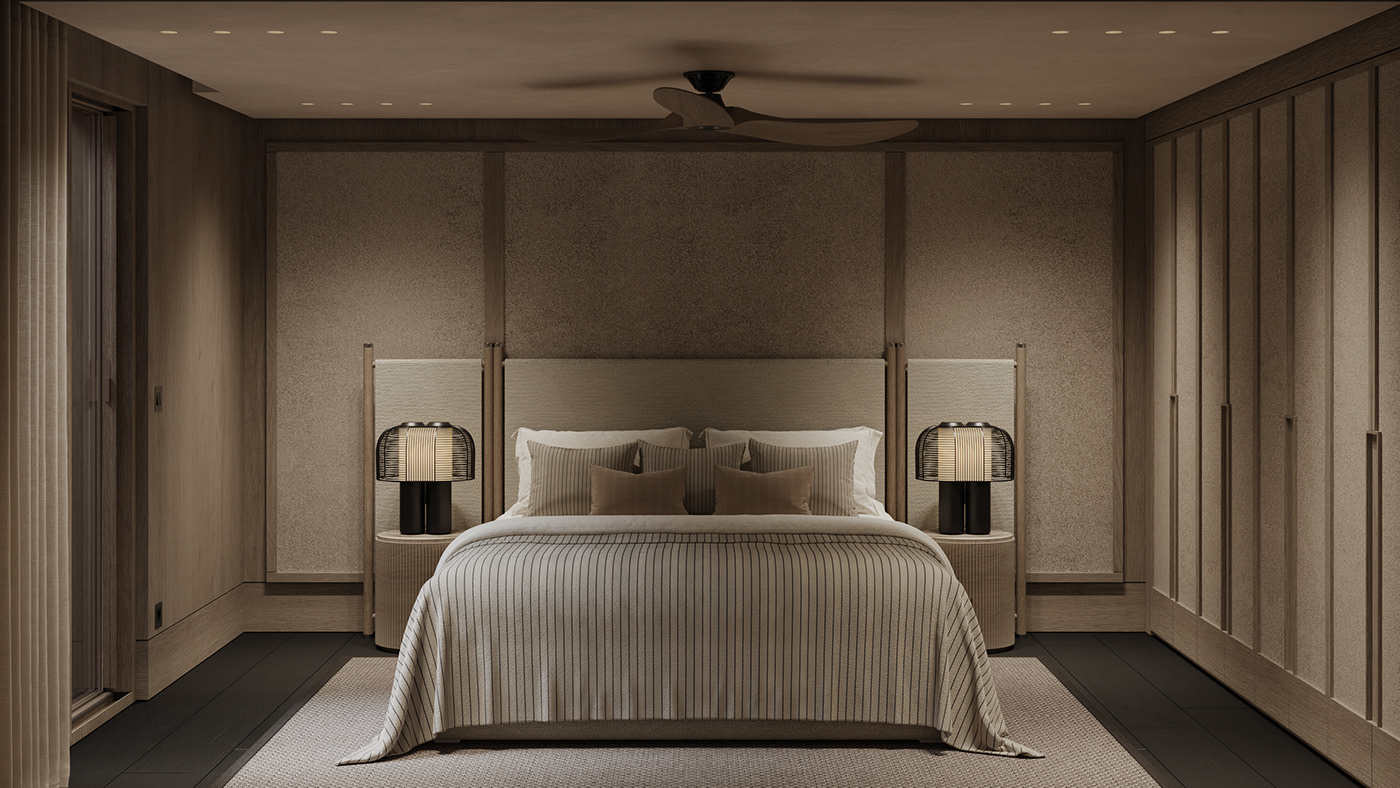 This bedroom is calm and cocooned, designed for rest and privacy. A symmetrical layout, soft upholstered headboard, and warm neutral tones create a balanced atmosphere. Gentle lighting and layered textures keep the space feeling understated.