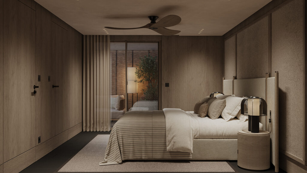 This bedroom is calm and understated, designed as a quiet retreat. Warm wood paneling and a soft neutral palette create a cocooned feel, while clean lines keep the space visually light. The low bed and subtle patterned headboard add gentle texture without distraction. Soft daylight filters through layered curtains, and a small seating area by the window offers a moment to pause and unwind.