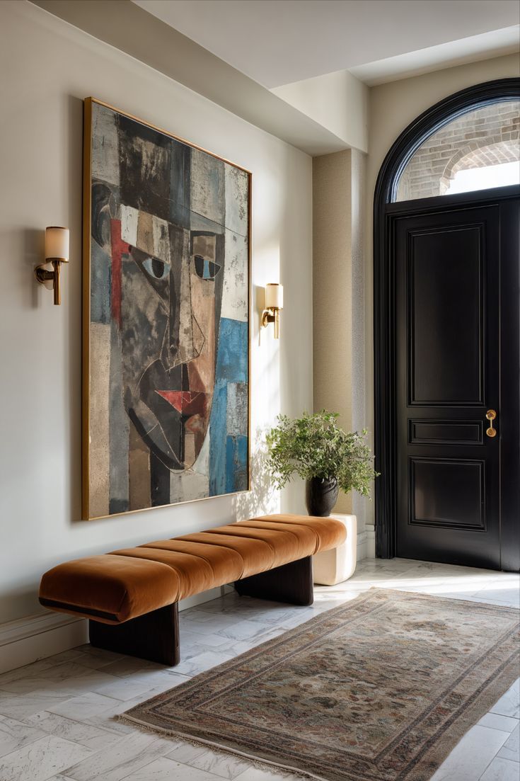 Large-scale art works surprisingly well in today’s entryways because it gives the mind something calm and grounding to land on during arrival. In a world of constant short door interactions, deliveries and interruptions, a strong visual anchor helps the threshold feel intentional rather than transitional. Oversized artwork also reduces the need for excessive décor, which keeps the space visually quieter. When placed just inside the door, art becomes part of the emotional reset ritual,helping shift attention away from outside activity and into the interior atmosphere of the home.
