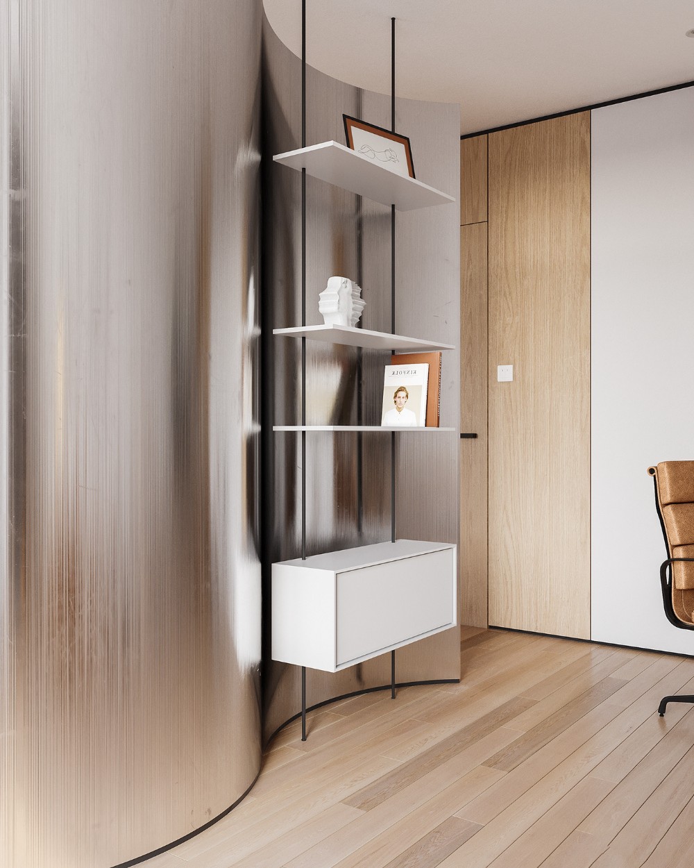 Things in the bedroom appear quietly elevated, carrying the same soft architectural language as the rest of the suite. It’s part of an open plan layout, but not in an “exposed” way. That’s thanks to the curved metal partition, which creates privacy without fully closing off the space.