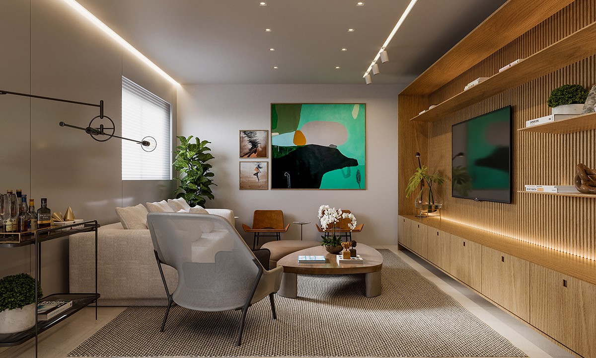 Overlay a vertically wood-slatted TV wall with floating shelves and a linear media unit. Add a boxed-out frame to isolate the module.