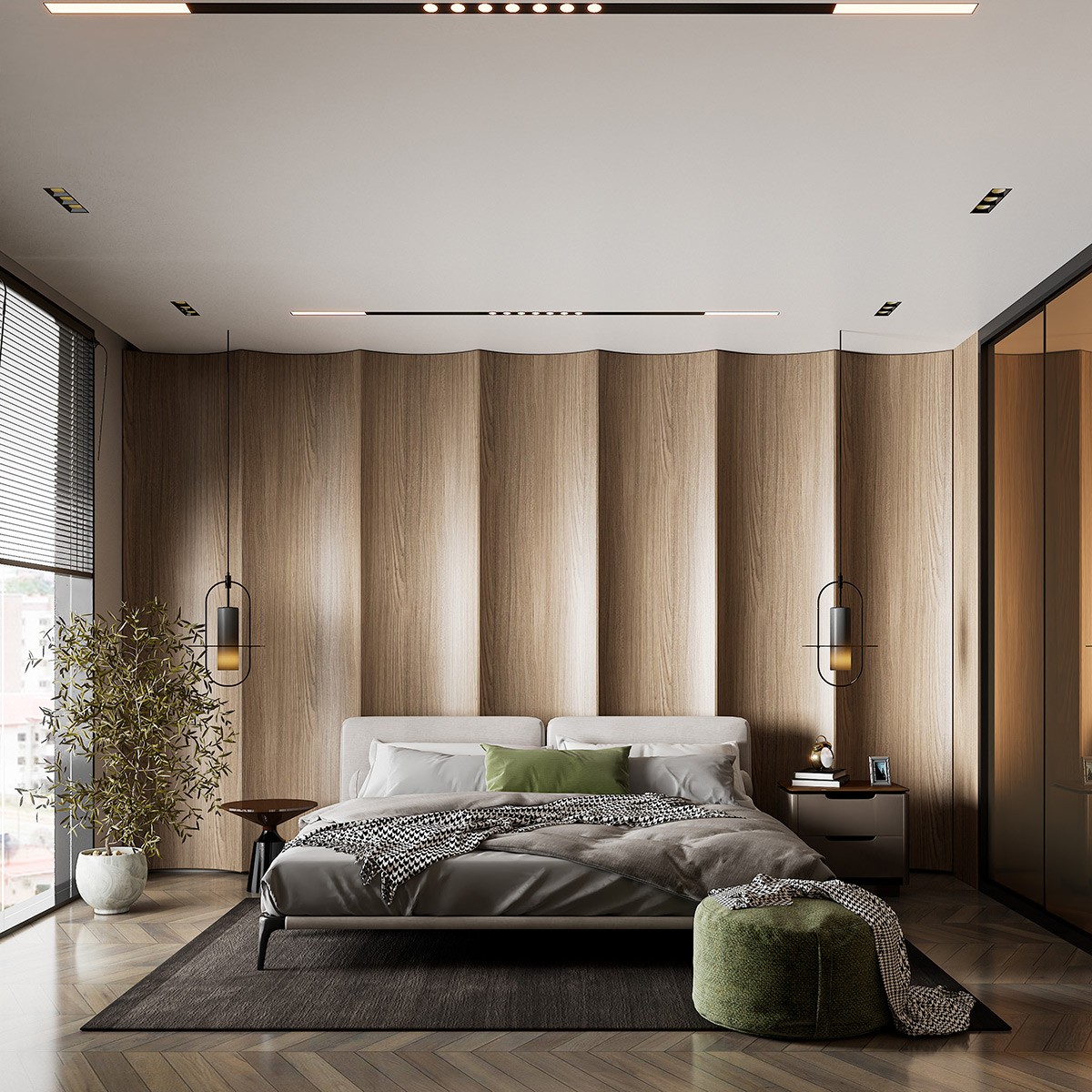 Inside this bedroom, a wood accent wall disguises the door to the ensuite bathroom.