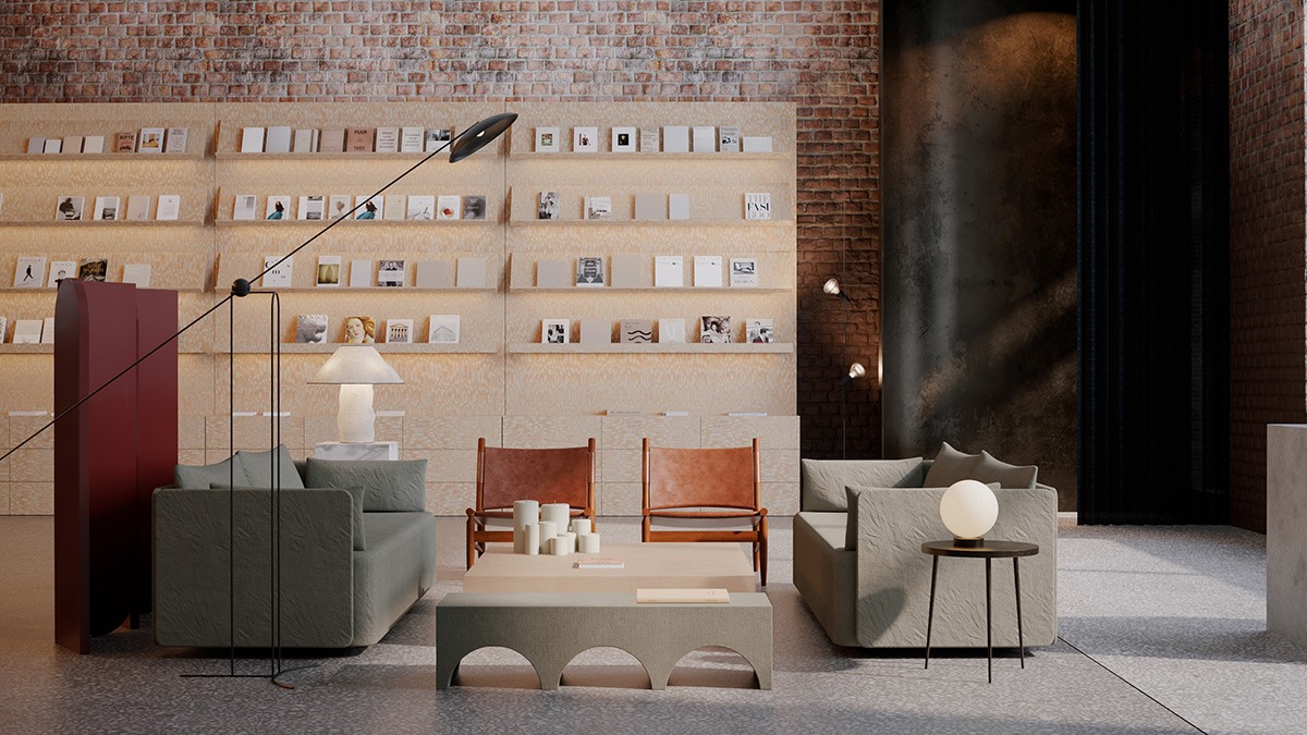 Pair bare wood and raw brickwork to build an industrial-style accent wall. This swathe of wood tone is a custom-made bookcase, which turns all of the homeowner's favorite tomes into a personalized display.
