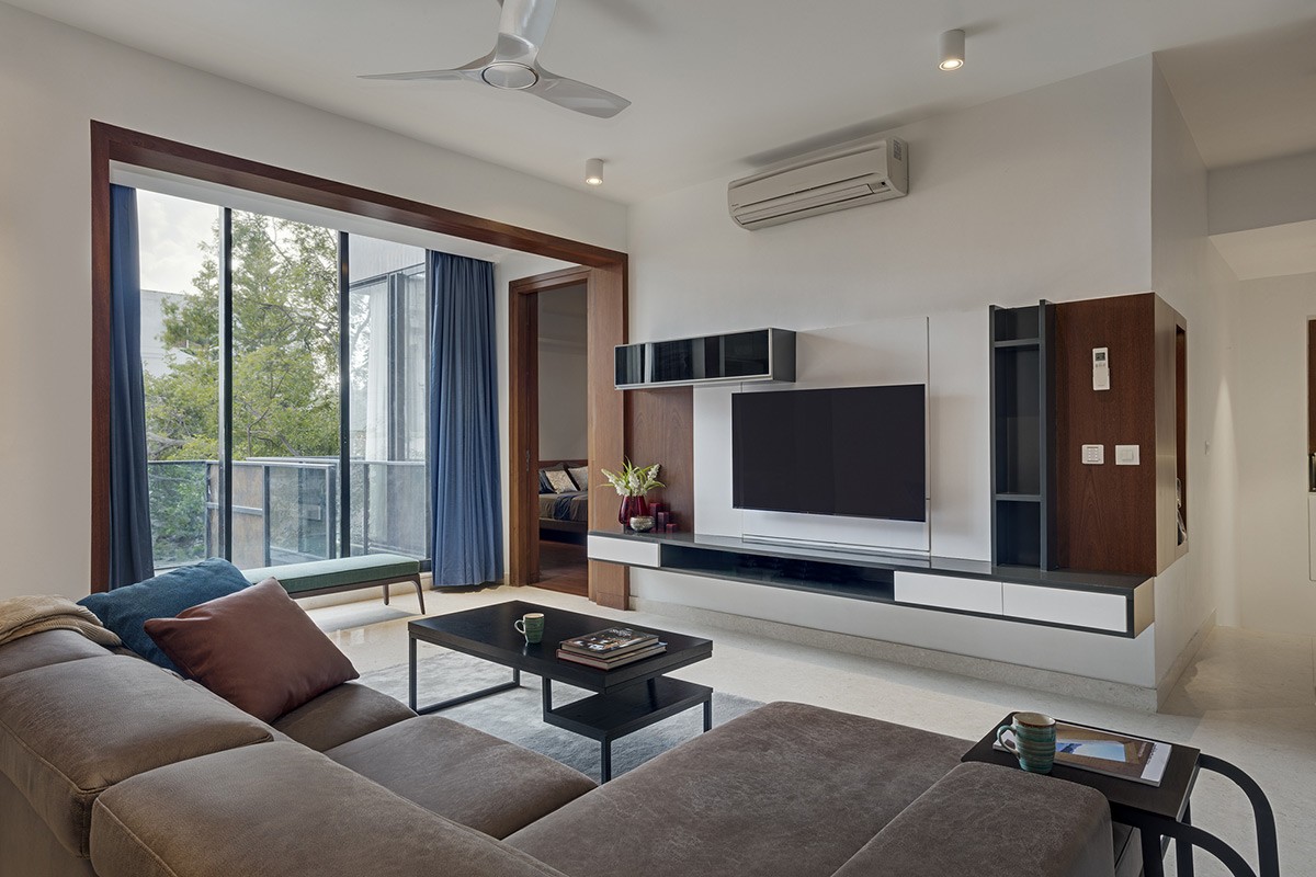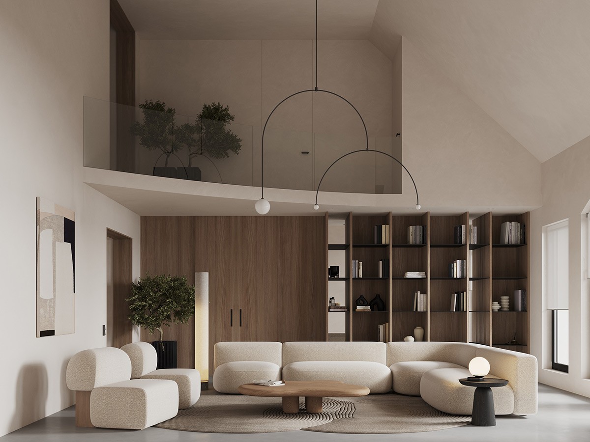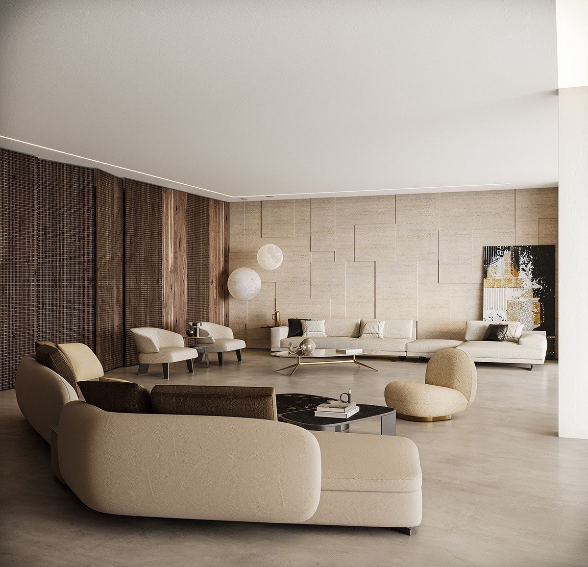 Rotating wooden fins divide this living room from its neighboring space. The wall of wood delivers a rich depth of color to the neutral scheme and complements a pale, travertine focal wall.