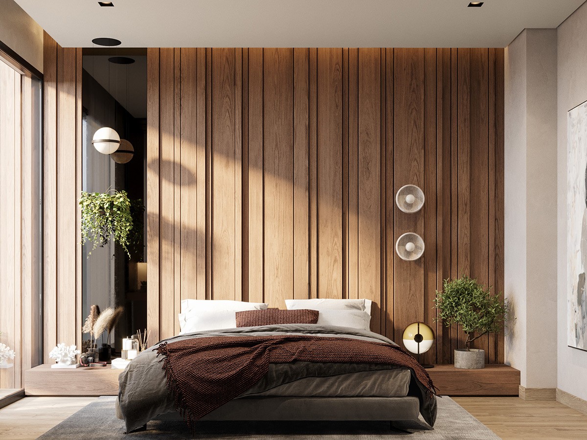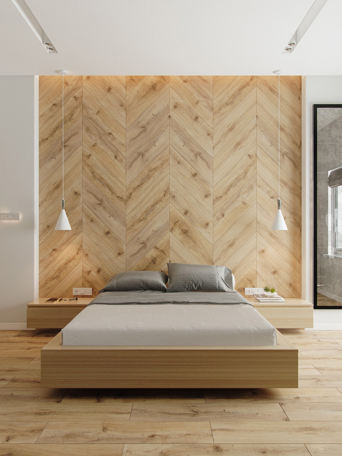 Cut a geometric pattern for your headboard wall. Float matching wooden nightstands across it and choose a coordinating wooden bedstead.