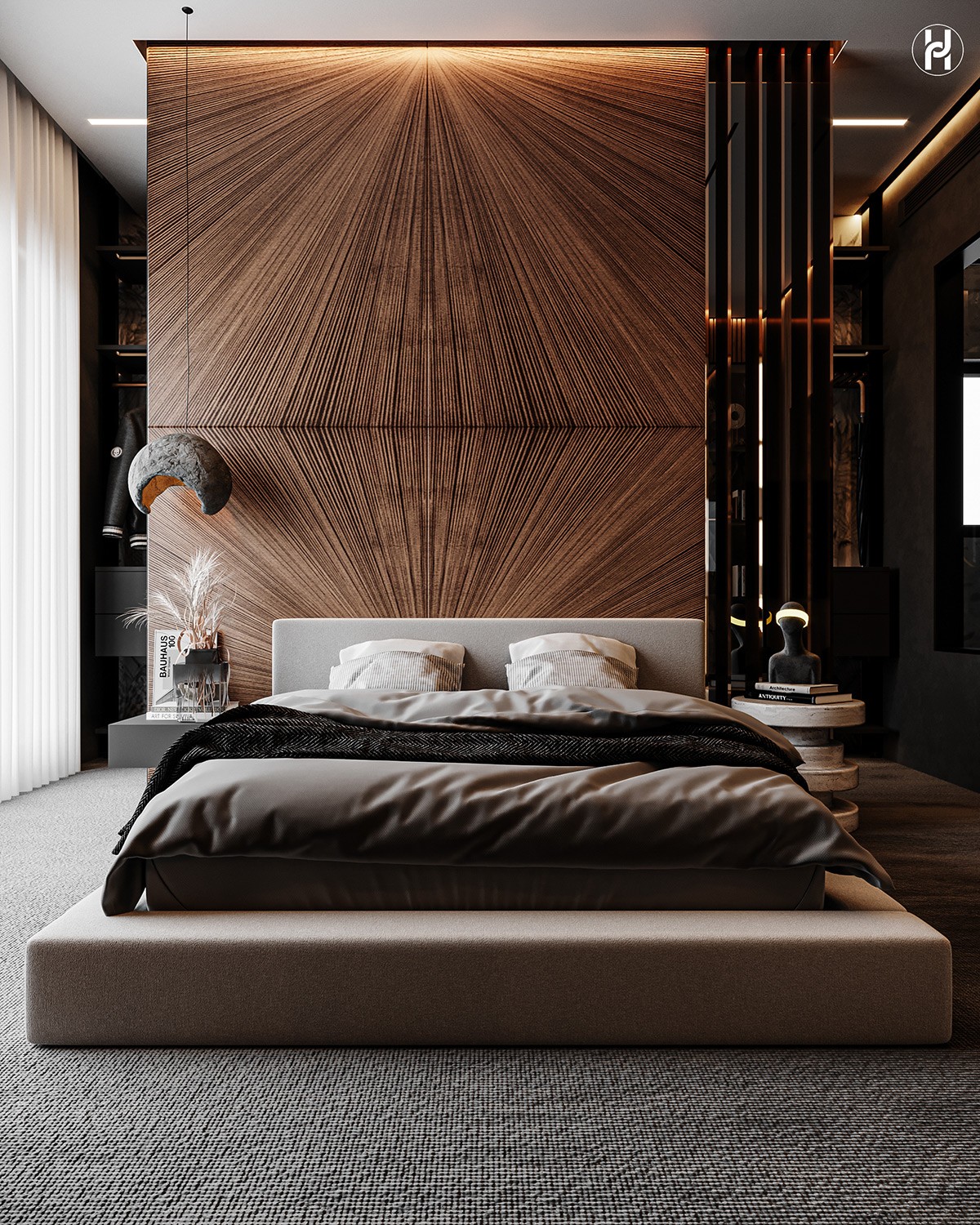 This wood headboard wall design uses thin slats set at different distances to create an elegant art piece.