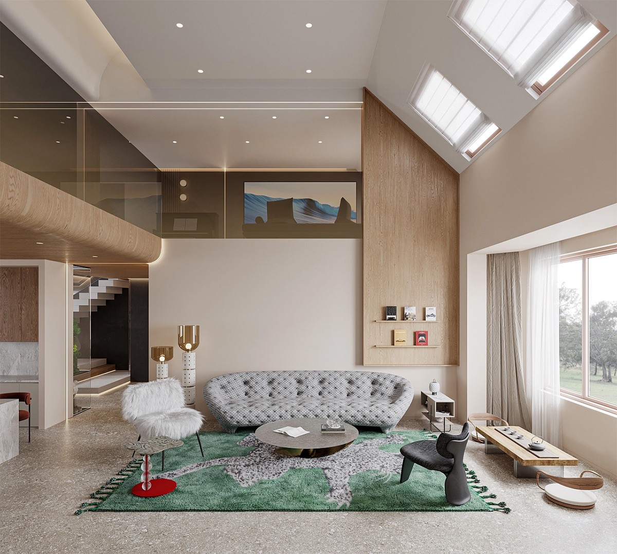 Stretch a vertically wood-planked wall up and across the ceiling to make a striking wraparound effect. This approach works particularly well in lofty double-height living spaces.