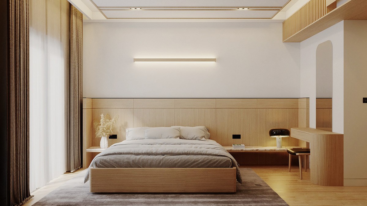 Sunburst wood grain rising above the bed makes an invigorating sight to wake up to.