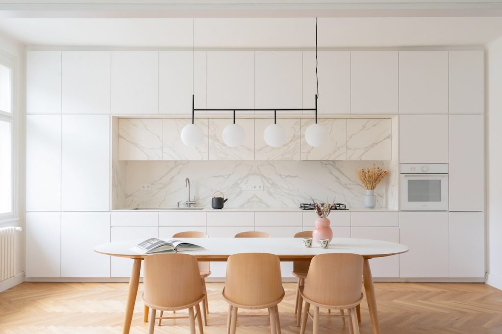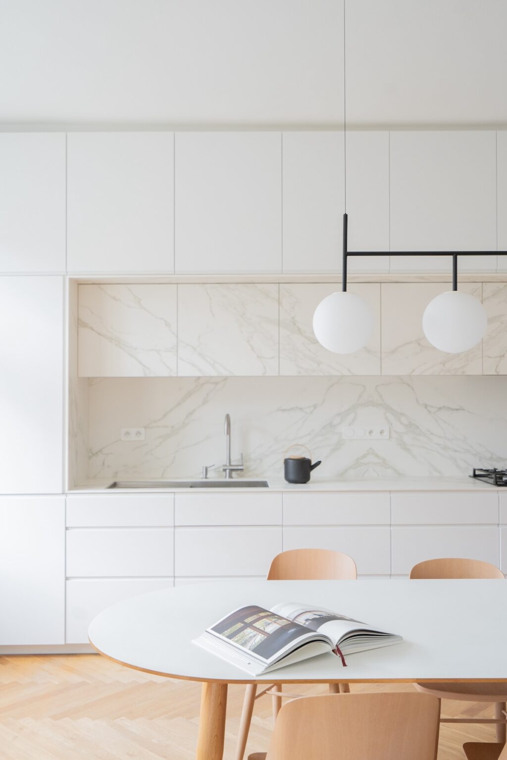 The combined kitchen, living, and dining area perfectly captures the Scandinavian modern aesthetic. Sleek white cabinetry—paired with marble backsplash—takes up one entire wall. This provides functionality while lightening the color scheme. This is paired with the light oakwood flooring and dining table warming the space up.