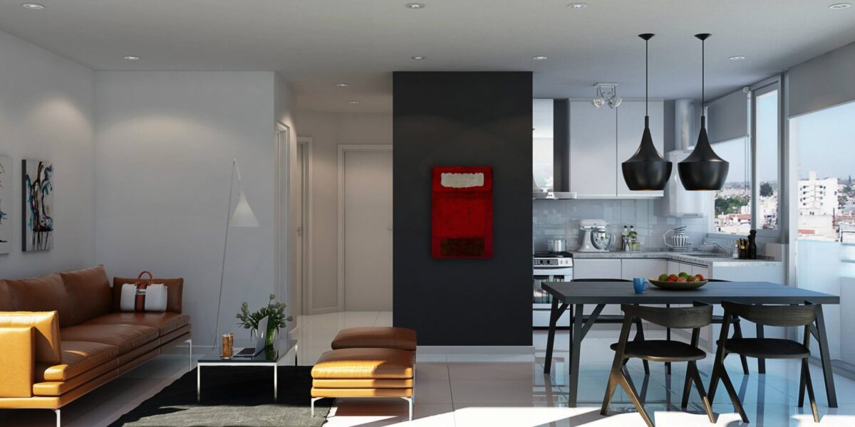 Instead of leaving the kitchen completely open, this apartment makes use of a half wall, so relaxing in the living room doesn't mean staring directly into the kitchen.