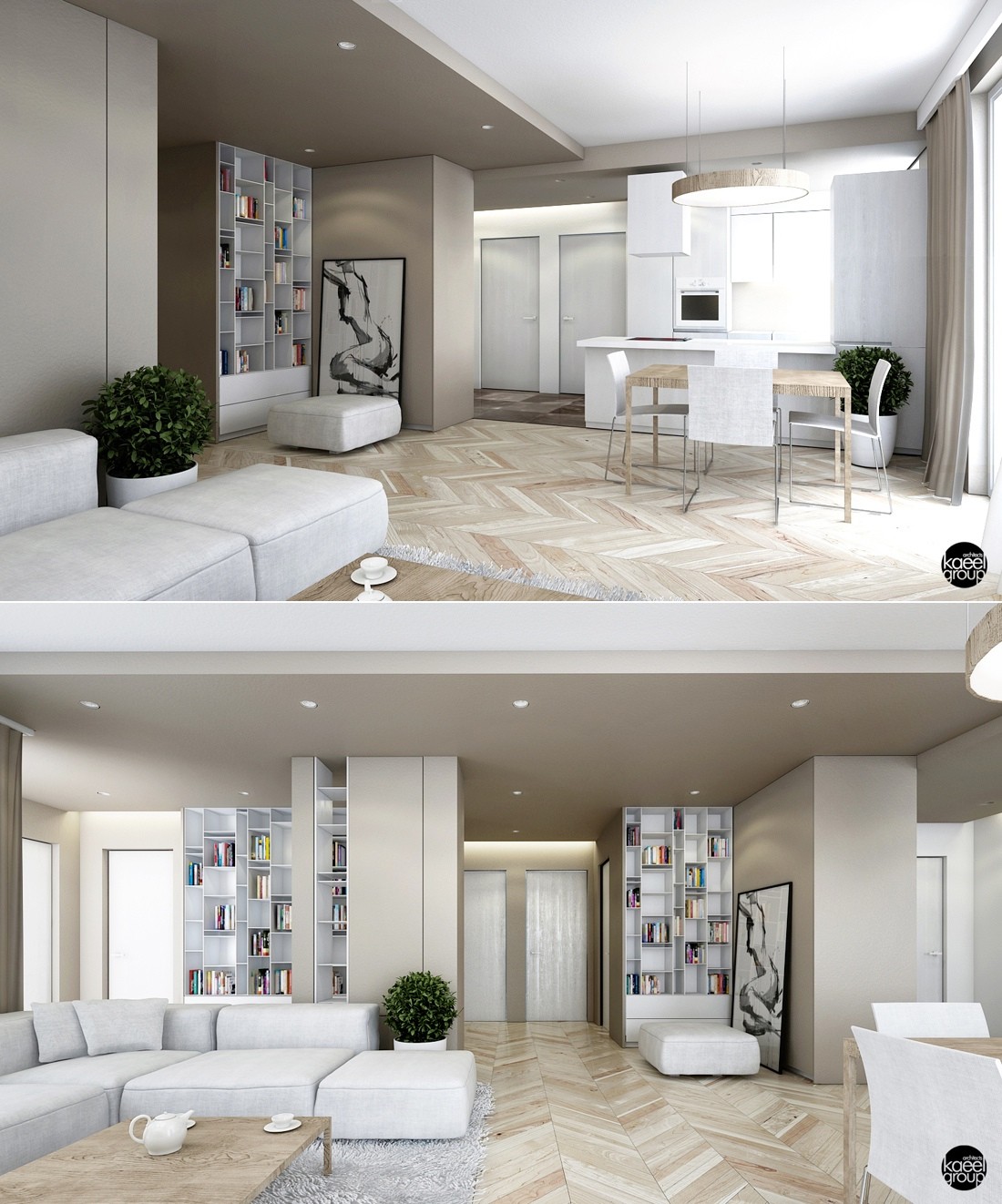 Using white for all the walls, cabinetry, and even the ceiling really makes this open space feel bigger.