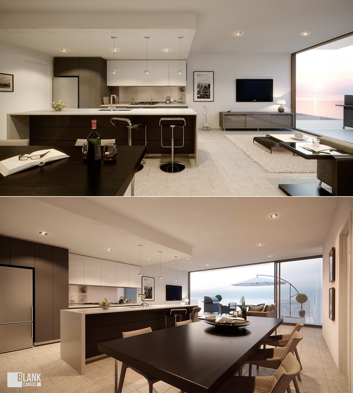 Finally, this beautiful modern apartment has accordion glass doors that make the open floor plan feel like it includes the whole world.