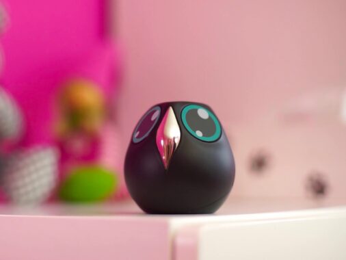 Feminine and airy, this attic bedroom plays on the colors fuchsia and purple. The closet is white and the walls are white. The only colored accents are painted on the built-in shelves, used on the headboard, and bedding. A metal lamp reflects the other colors and shines on the angled wall.
