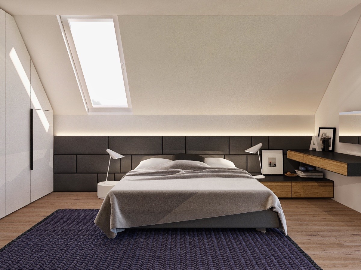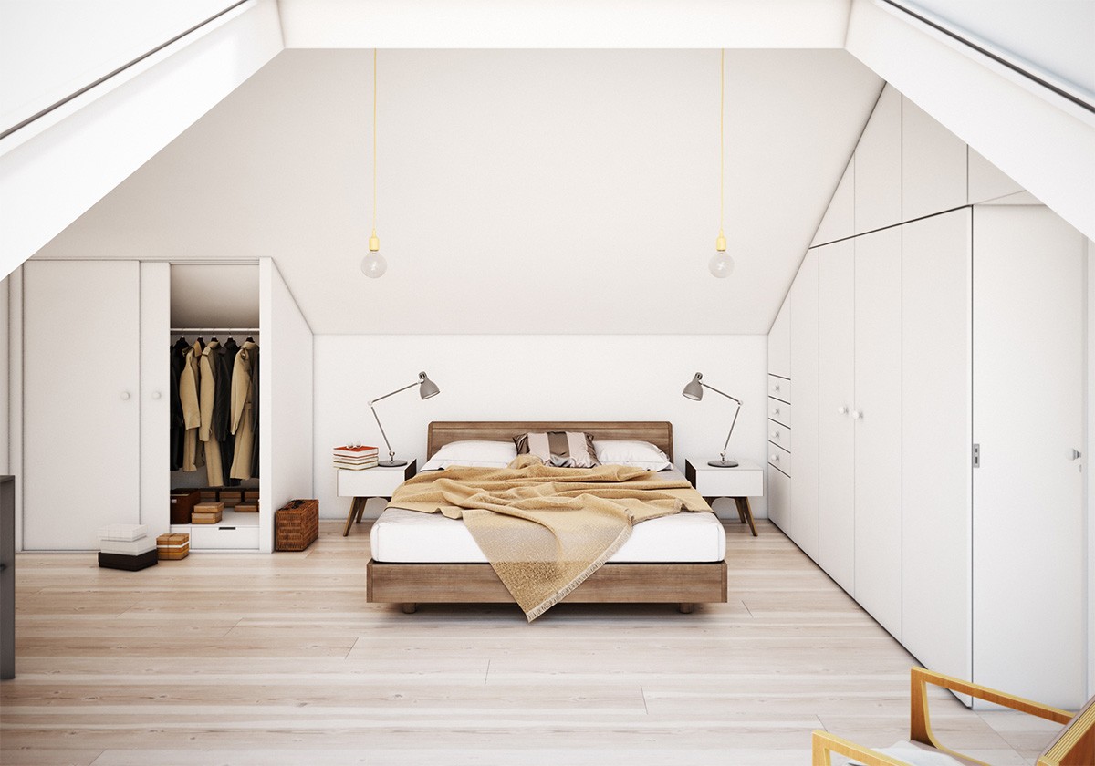 The visualizer Yuriy Bobak decided to illuminate the architectural detail in this attic bedroom. The beam that runs the width of the room has under lighting. This gives it an ethereal glow. The bed is kept low to the ground and white. Storage items, like baskets and white boxes are used as nightstands and organizers.