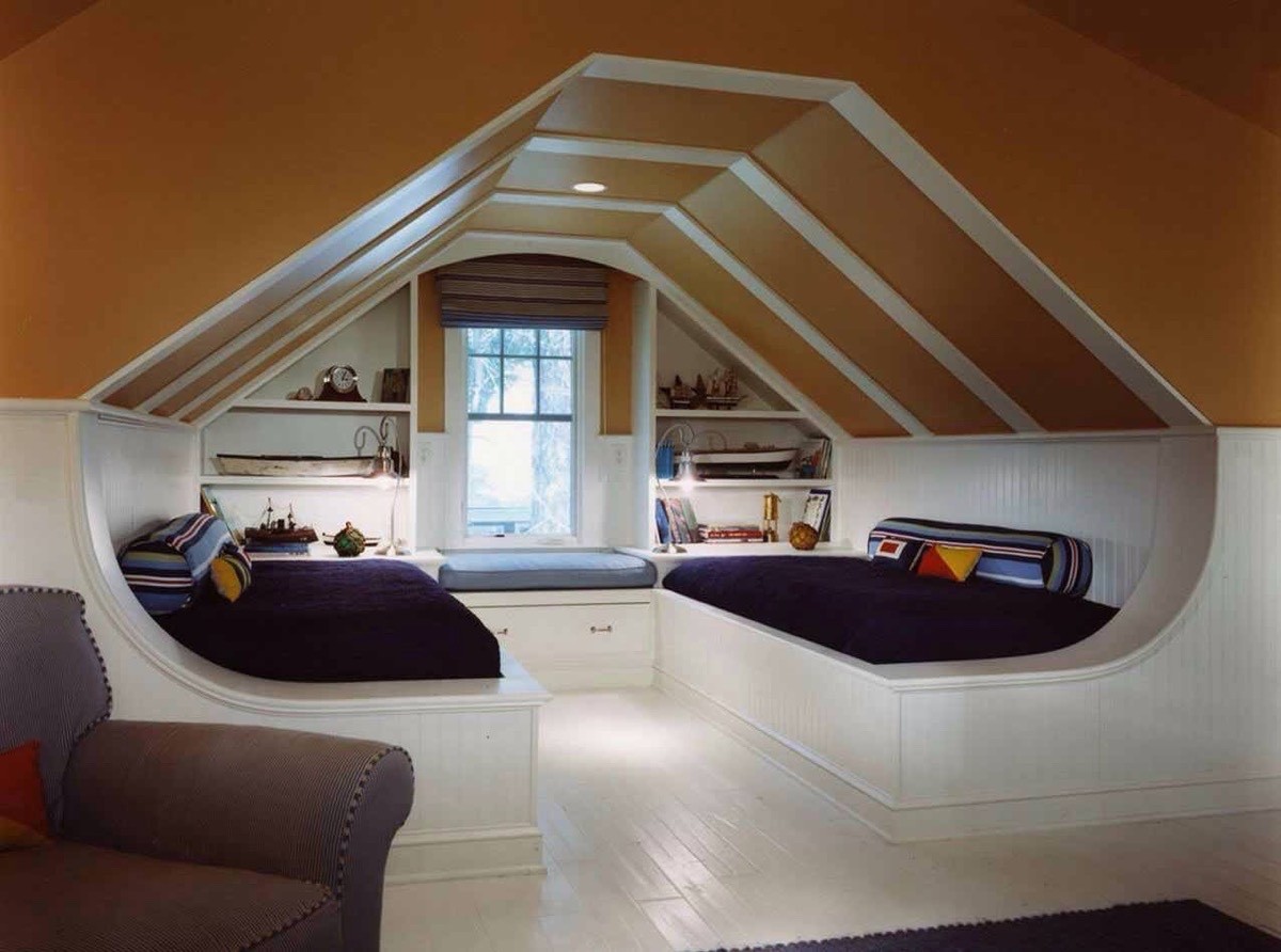 The beauty of designing an attic space is working with the interesting shape. In this attic, the designer embraced the shape of the ceiling and built in two twin beds and a window seat. By painting the panels, the eye is drawn to the unique architectural detail that inspired the built-ins. There's also some hidden storage under the seats which is perfect for sleepovers and a kids room!