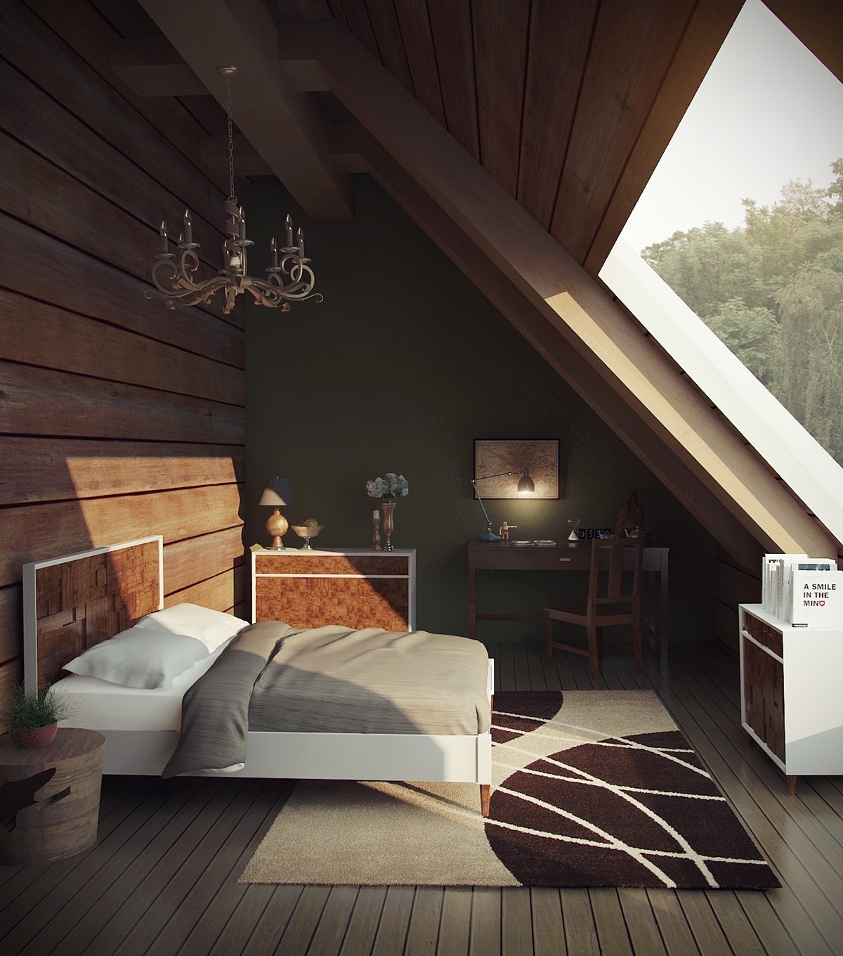Wood walls don't make this bedroom look dark because they are lit up by the large angular window. The white platform bed contrasts well with the wooden accents and matches the modern floor rug. A quaint desk is tucked away in the corner, which makes this attic feel feminine and delicate. The bedroom chandelier adds to the charm.