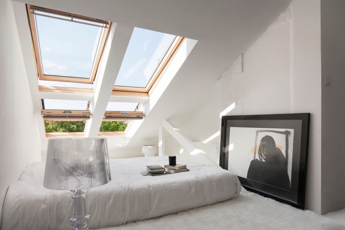 Bright and white, the only thing holding this attic bedroom down is the dark hues of the bed and the chair. The ceiling comes together like the shape of a barn and the windows melt into the walls with their white shade. A small window ledge showcases art, books, and natural colored items. The few furniture pieces that are in the room are streamlined and dramatic. The light, bed, chair, and wooden side table are kept near-to-the-ground to contrast with the tall ceilings. The colors of the bedroom chair and bed also help with the contrast.