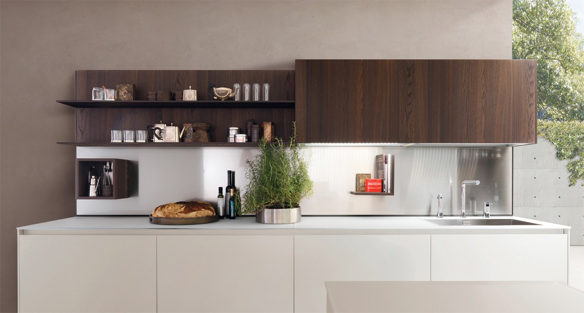 A stainless steel backsplash separates the dark vertical wood cabinetry and shelves from the matte white cabinetry below.