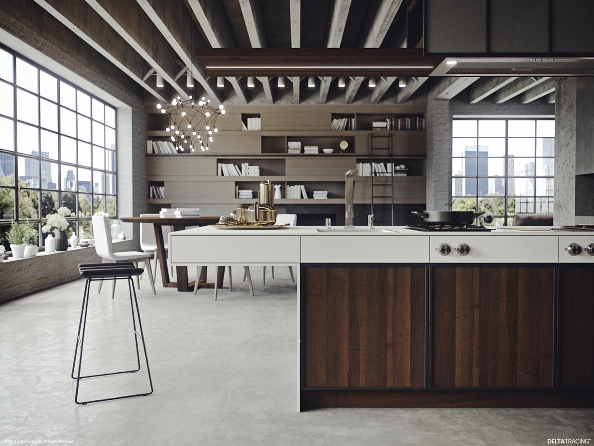 Industrial and classical elements come together to create a sophisticated space in this open kitchen. The walls are clad with dark wood, with lighter tones used on the cabinet faces. Stainless steel elements add bright highlights. Keep in mind that having an open shelving approach like this means that every one of your accessories on display - including knives, wine glasses, mugs, cutting boards, teapots, cookie jars, etc. - need to be on point.