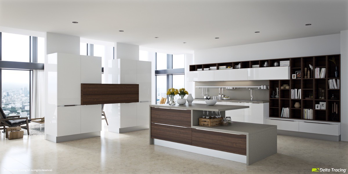 This kitchen is defined by its glossy white surfaces, helping it stand out from the rest of the living area.