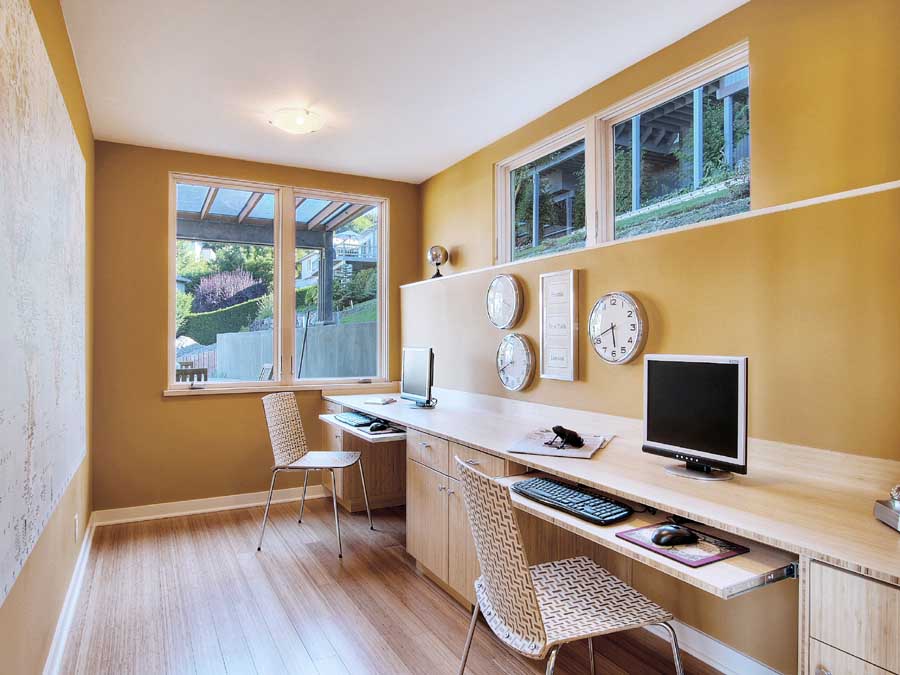 Fresh cilantro and inky black make an impact against rustic wood elements in this attractive basement living space remodel.