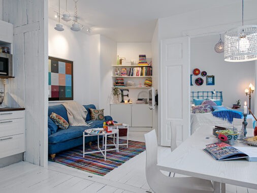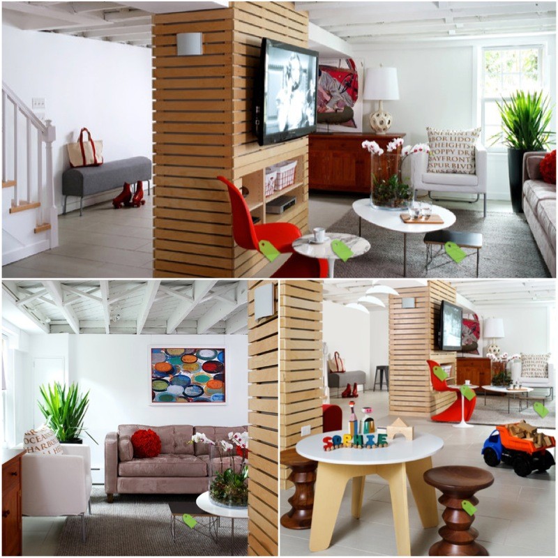Vibrant pops of color bring this basement living space to life.