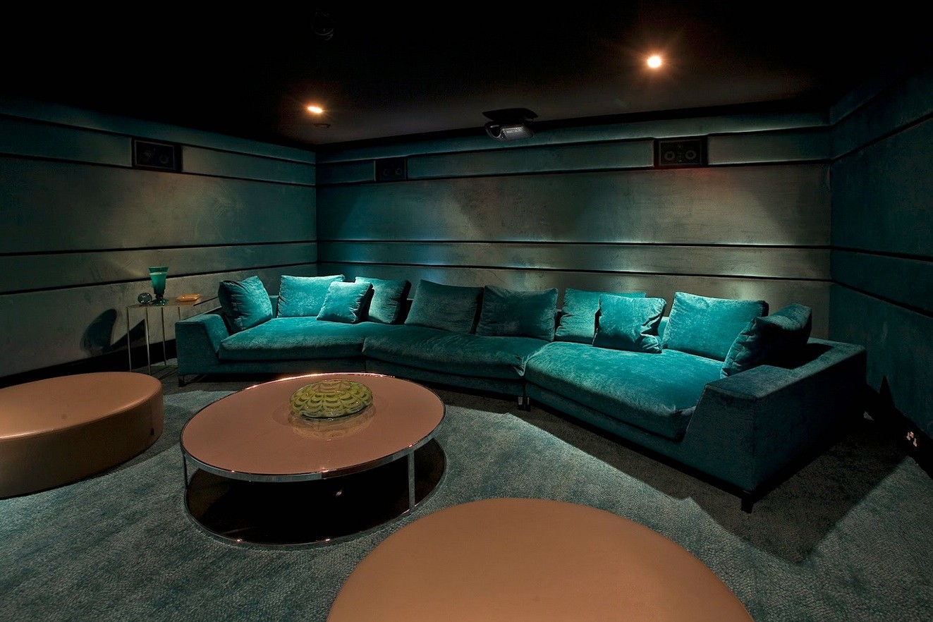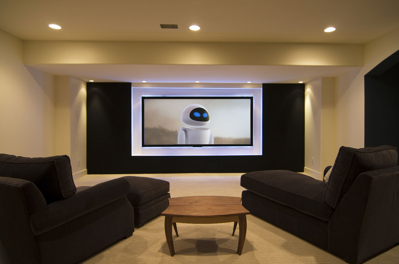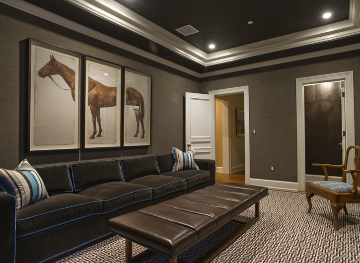 The dome-shaped ceiling opens up this media room basement . The fireplace under the media screen offers ambiance.