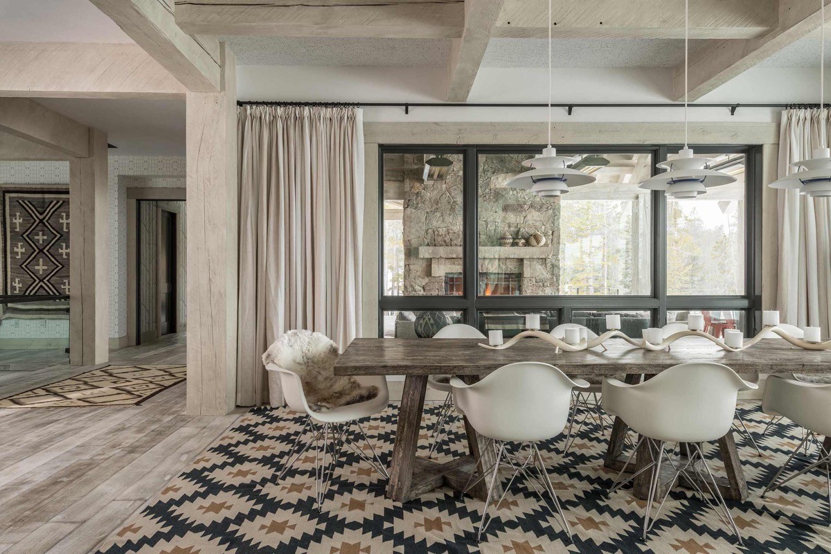 Amazing exposed wooden rafters do all the talking in this lofty rustic interior. In the centre of a long wooden table, two tall candlesticks are almost tall enough to touch the trio of slim pendant lights.