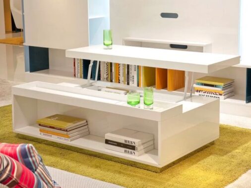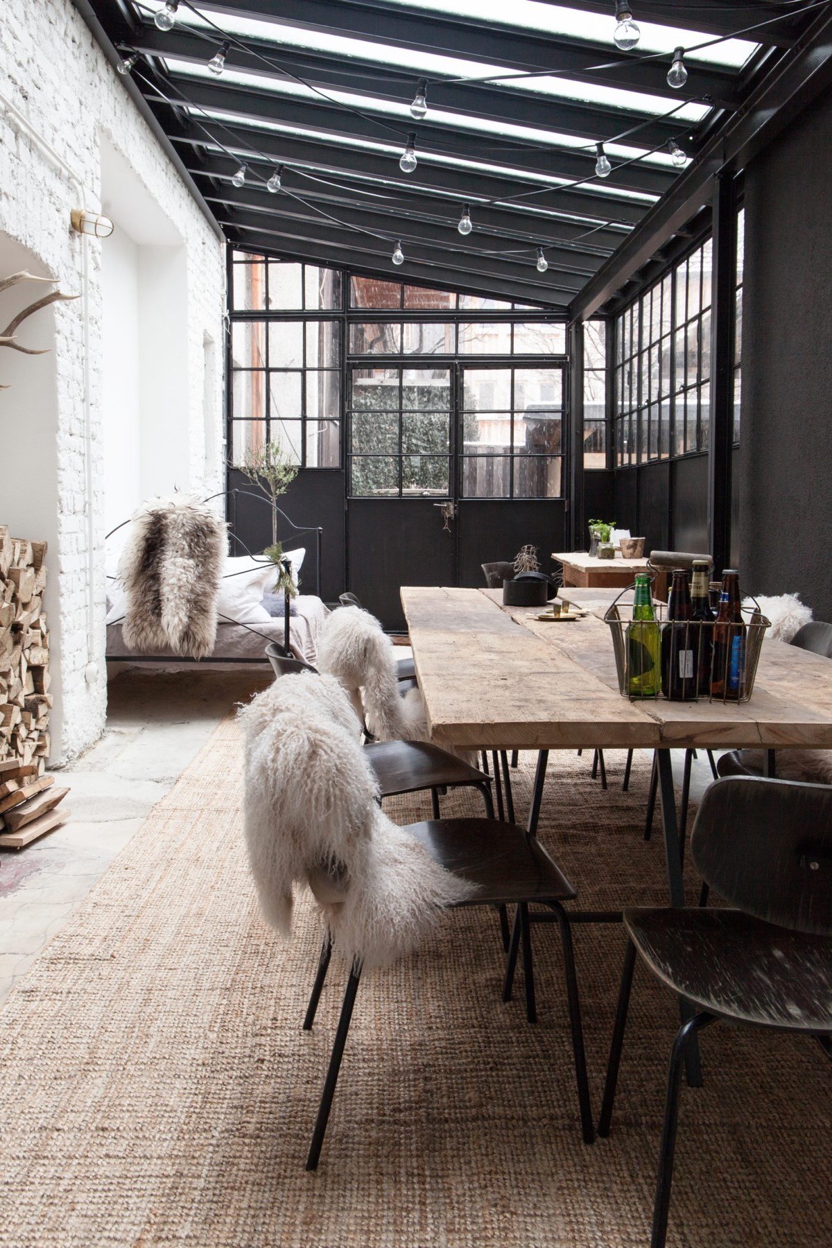 Faux fur throws give this dining room a cosy rustic flourish, and softens hard wooden seats. Over at the other end of the room, a daybed receives the same treatment. Festoon string lights zigzag across a glass panelled ceiling, all set to add twinkling light overhead during late evening meals and nighttime festivities. A natural weave rug keeps things a little toastier underfoot by creating a barrier over a cold stone floor.