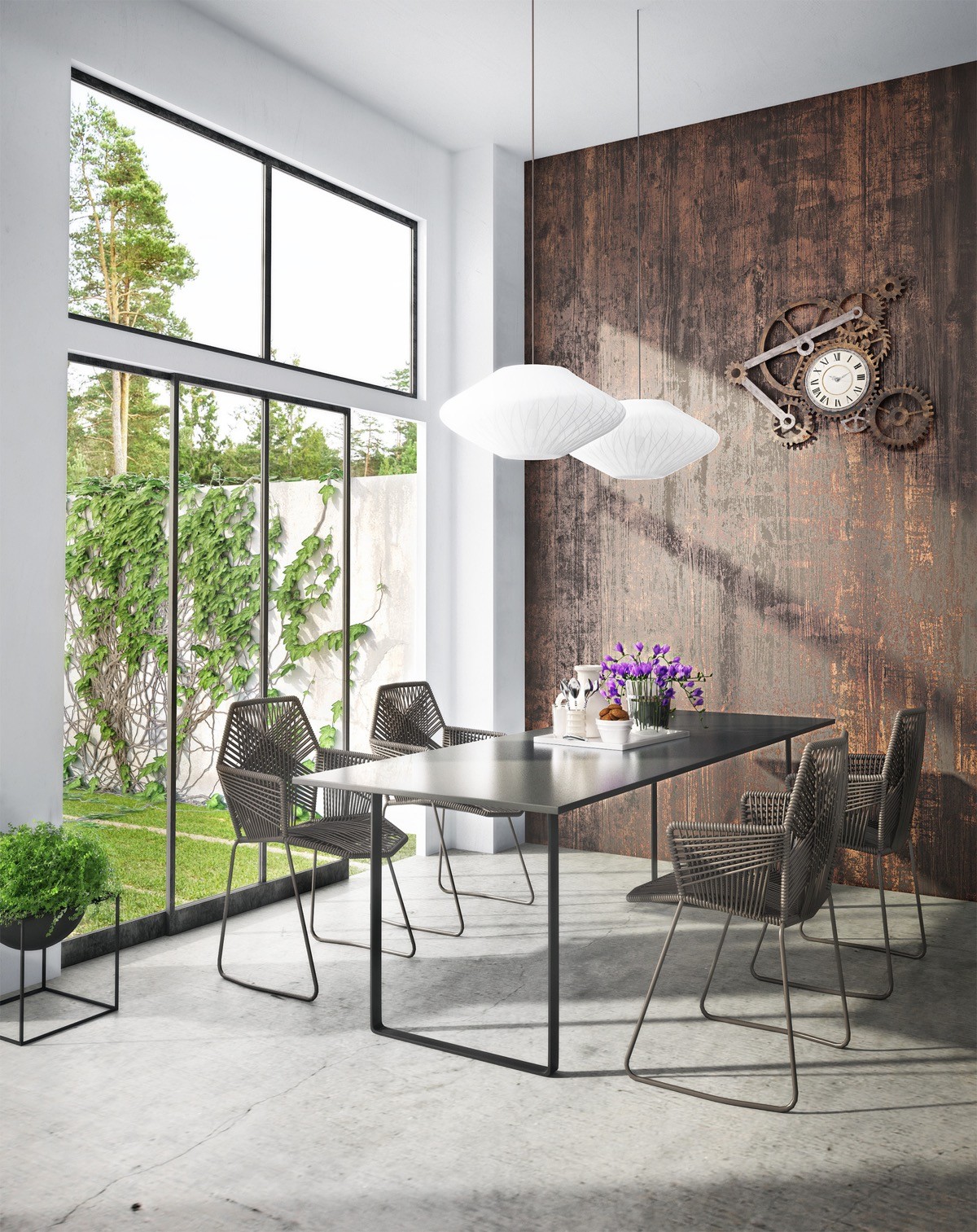 In this space, a sleek dining table and geo dining chairs look particularly modern, but teamed with a distressed wooden feature wall and a steampunk clock the suite settles into a rustic vibe.