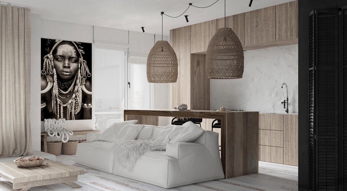 This modern tribal chic home has a pale wood dining bench tucked neatly behind a sofa, coupled with contrasting black bar stools.