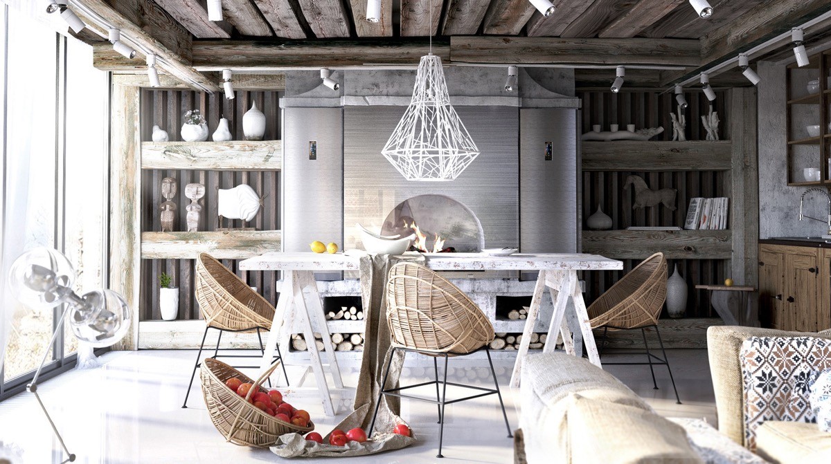 This mediterranean rustic chic decor scheme has a wonderful sense of sophisticated refinement about it. The roaring fireplace set atop a large store of cut logs makes the perfect accompaniment. The modern dining chairs surprisingly meld well with the overall scheme.