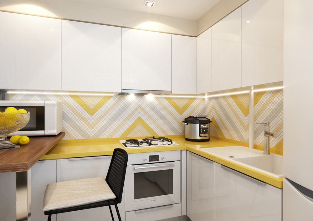 The raised breakfast bar leaves a tiny gap below the microwave for semi-hidden storage. Small spice jars could fit well here.