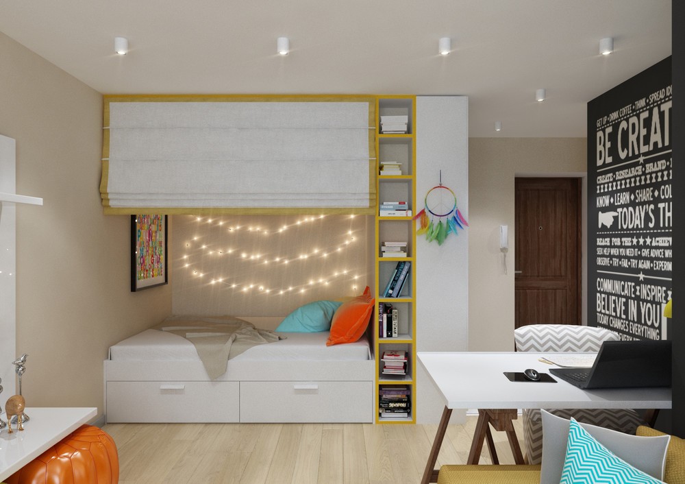 But look at this cute bed area! The folding shade offers a sense of privacy, under bed storage caters to the organized soul, and string lights bring the ambiance.