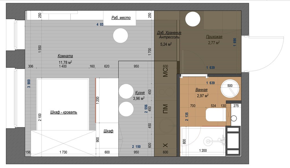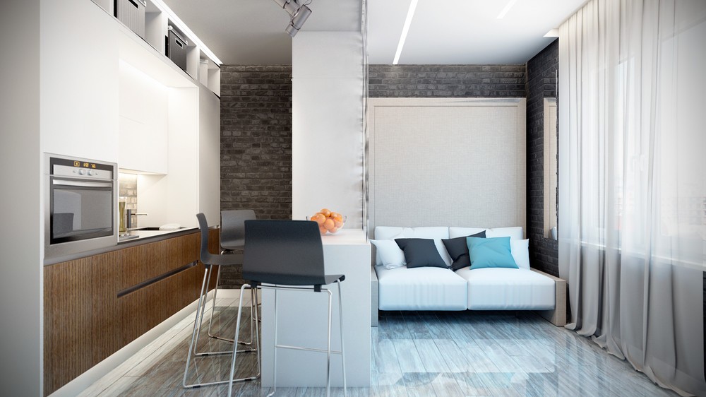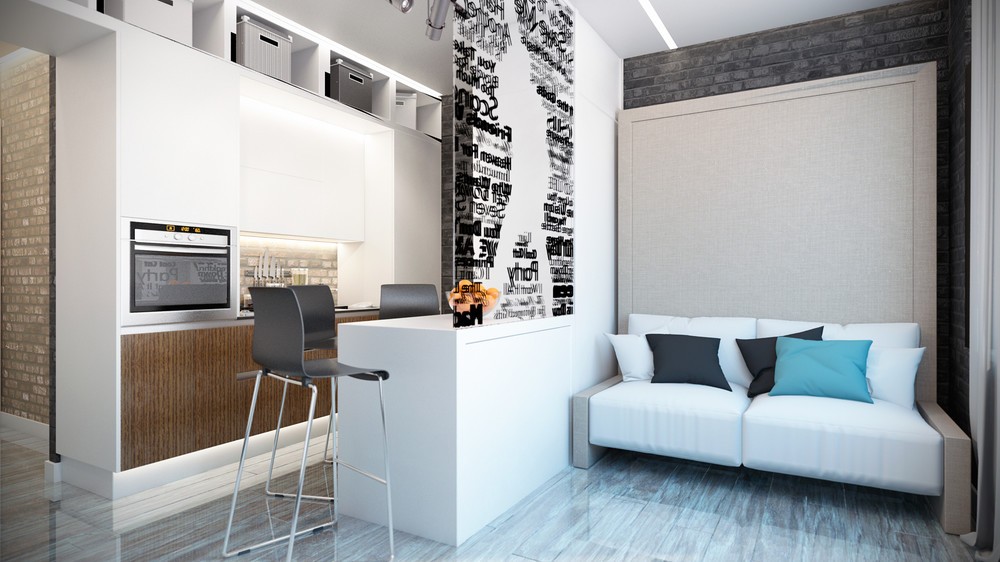 Gorgeous and efficient! This home centers around a living and sleeping area in neutral colors with blue accents, utilizing a Murphy bed from Clei Italy to preserve floor space without giving up any comfort or sophistication. This home offers abundant inspiration for anyone who needs to work around the smallest of interior floor plans.