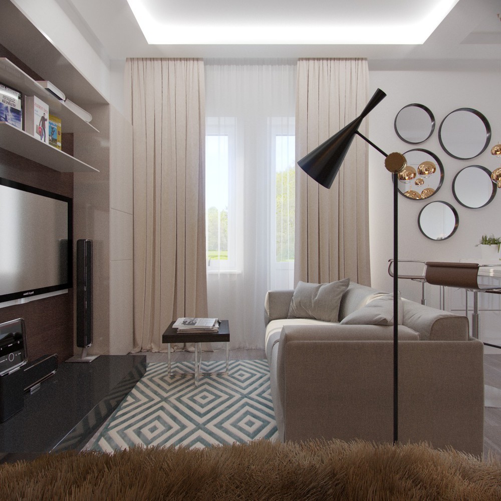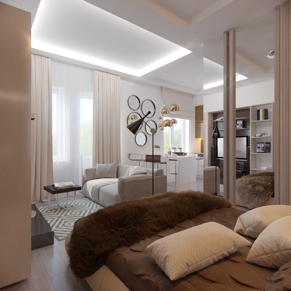 Here's another home designed for a young woman – one who travels often. The designer was inspired by Scandinavian design principals, hence the light-colored wood and the incredible sense of spaciousness. This home utilizes a mostly neutral theme with plenty of warm accents, and a good variety of distinctive round decor for visual interest At under 30 square meters, the amount of division between each space is truly inspiring!