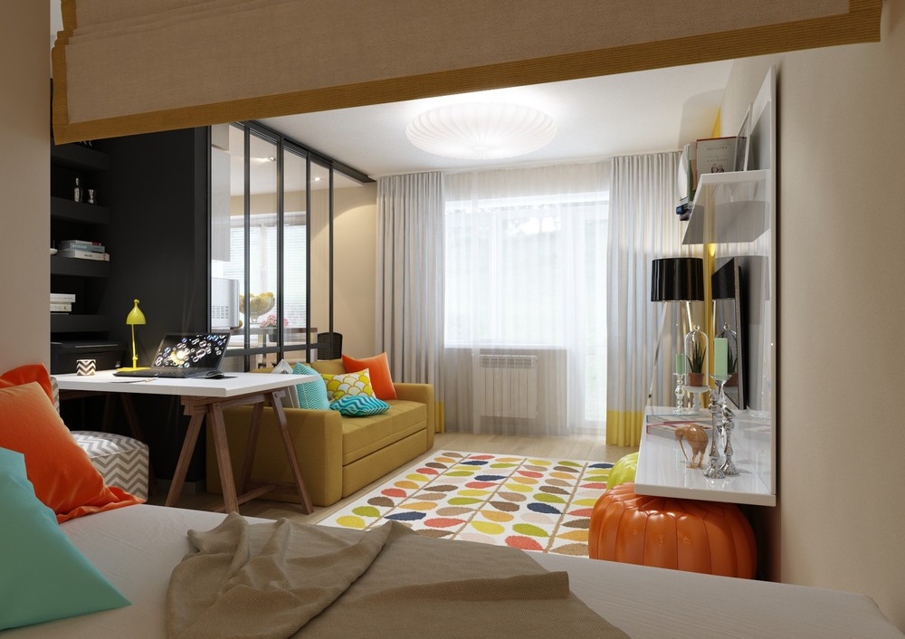 Working with a small space and worried about adding too much color? This small apartment isn't afraid of bold color themes at all! Delightful retro hues energize every square inch: oranges, blues, yellows, and greens… Each color adopts a bright tone, breathing plenty of life into an otherwise restrictive floor plan.