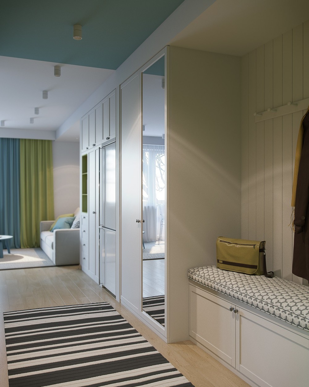 Now for the most important part: the built-in storage along the hallway facilitates the streamlined design in several ways. It not only houses the bookshelves and drawers, but also includes a spot for the refrigerator and the wardrobe.