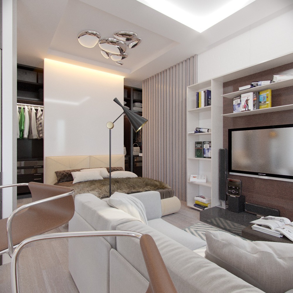 Designed for a young woman, this interior is defined by its smart layout and expertly framed zones. Within 26 square meters, the requirements included a kitchen that feels independent, a spacious wardrobe, and a workable office space. Here you can see the office taking up residence tucked beneath the television, and the transparent Louis Ghost Chair by Phillipe Starck ensures the view goes without obstruction.