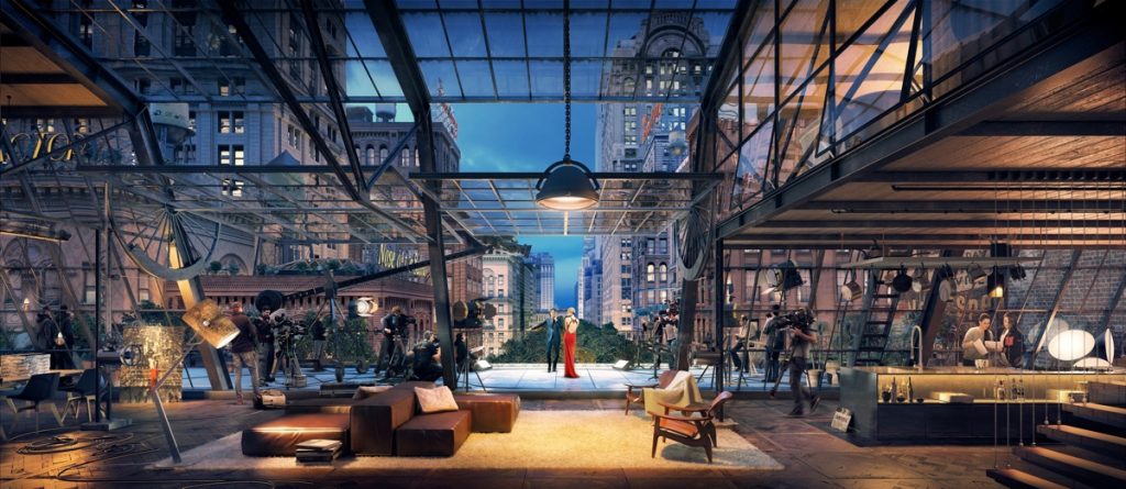 This is a ‘wow’ space. The ceilings alone can take your breath away - and we love how the visualizer has played on that old world feel with the oversized leather couch, a hanging bird cage, and even the old studio lamp in the back. The contrast of old and new is stunning.
