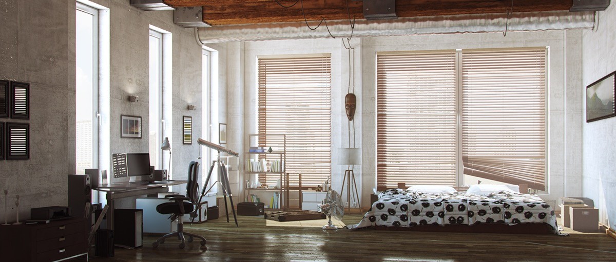 We love this loft because it looks like a real space anyone would love. With a desk area, scattered books and shelves, and a tilted shade - it’s like any 20-something could call this chic loft home.