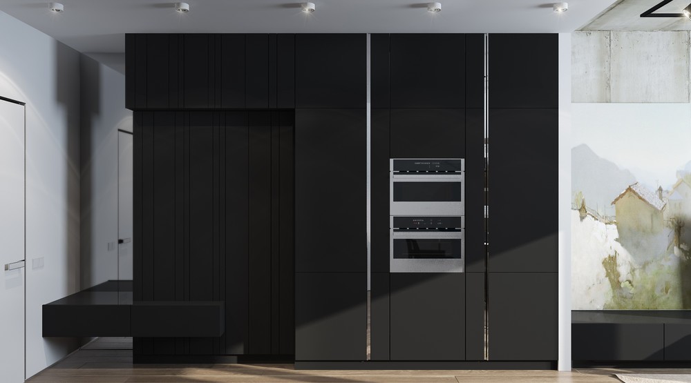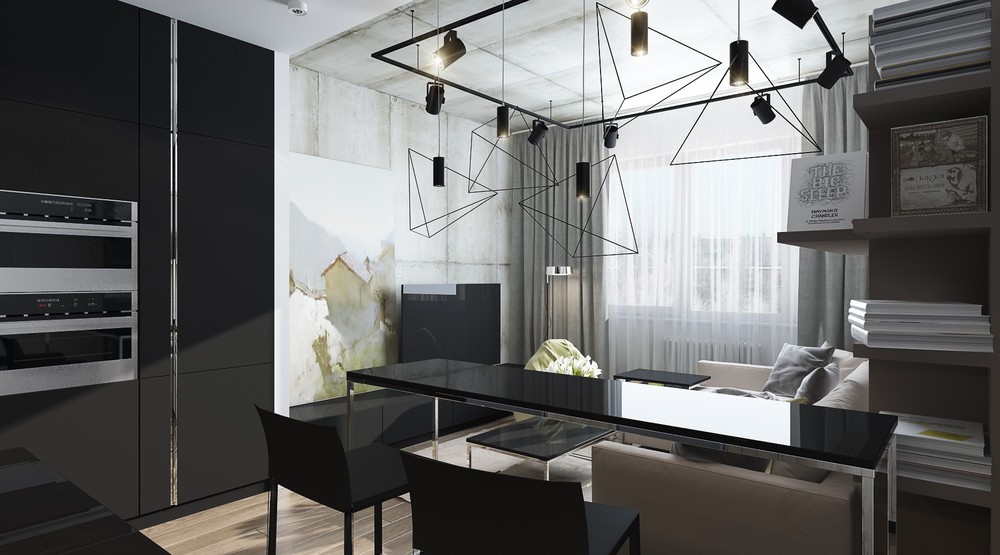 Black and chrome pair perfectly with the concrete ceiling. The industrial influence is easy to appreciate but an occupant with different tastes would have no trouble adapting it.