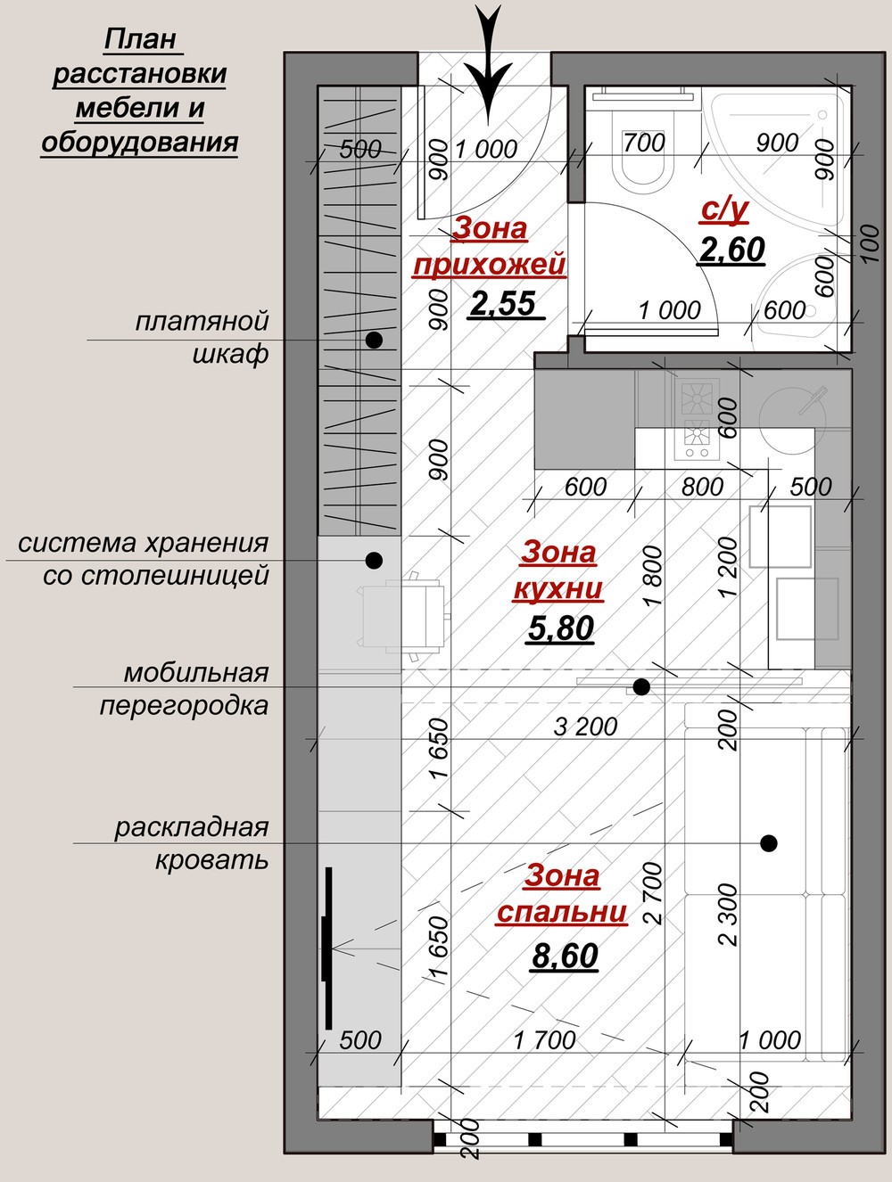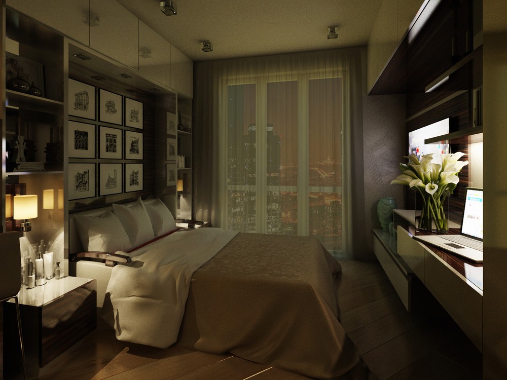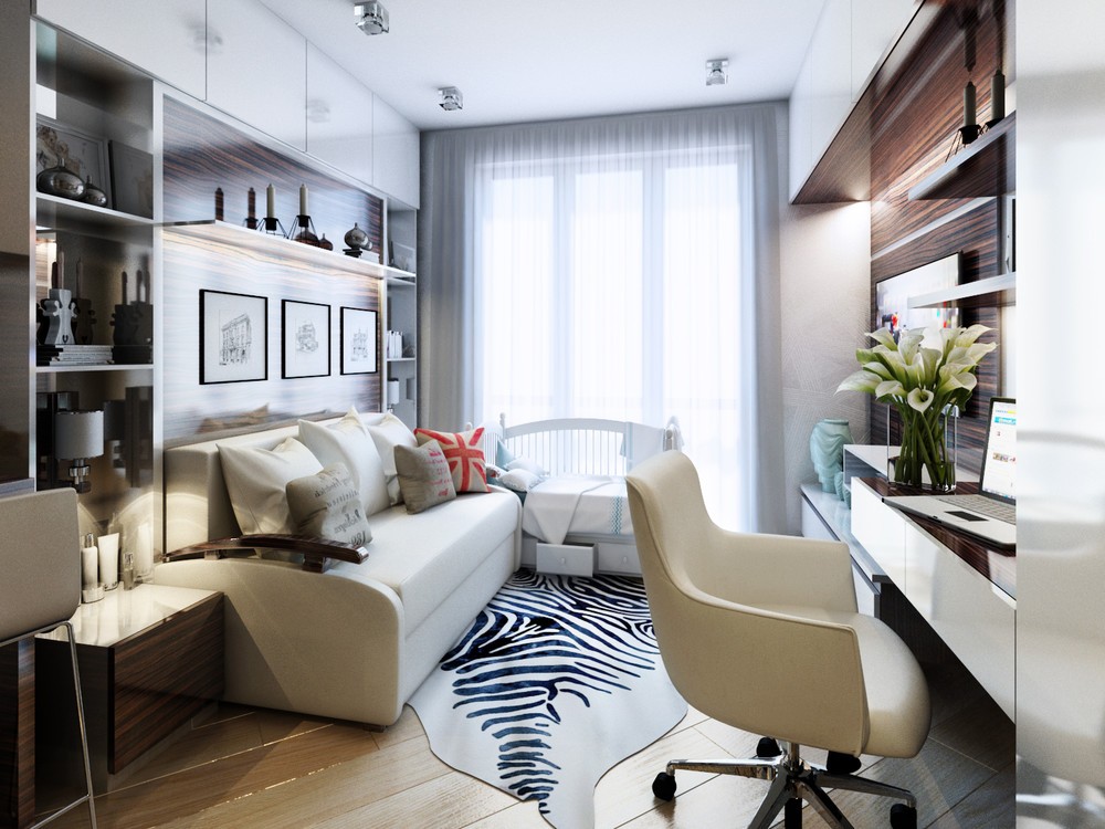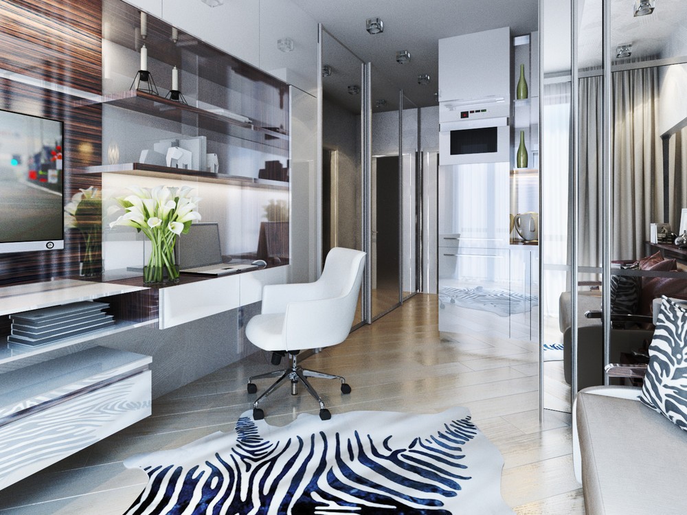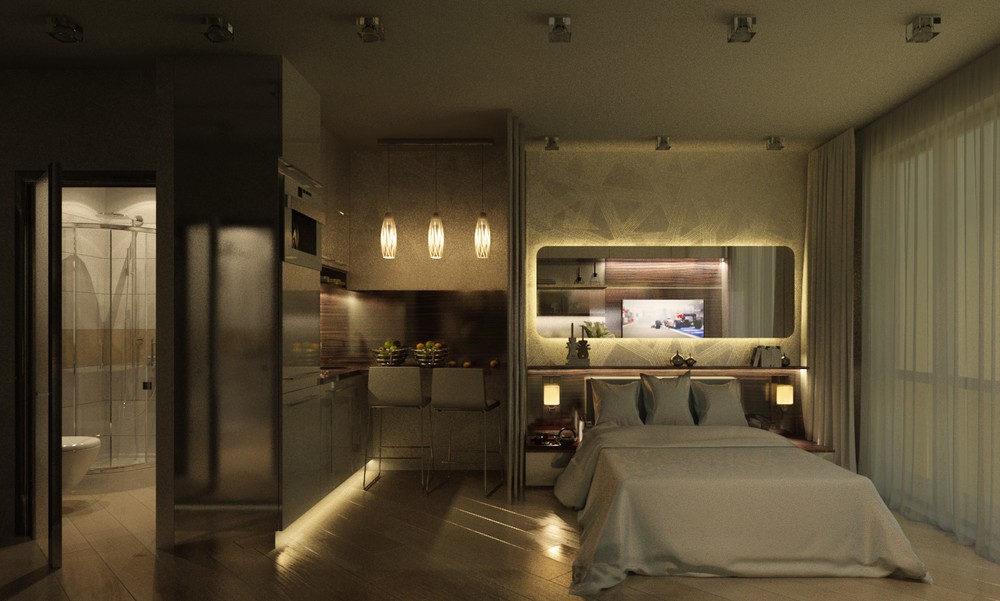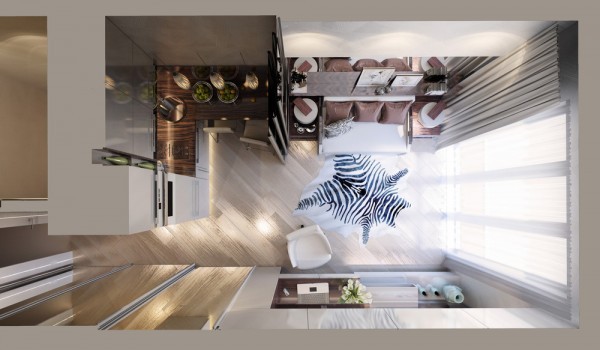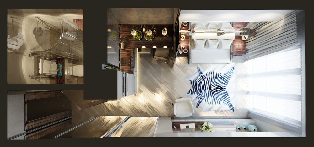 Catherine Remizov designed this apartment with a surprisingly classic and luxurious vibe despite its restrictive 20 square meter floor plan – and the result is bursting with personality! It contains all the necessities, some of which are hidden away with clever tricks to save visual real estate. Every inch of this apartment reflects a strong and adventurous personality, and seems to utilize each available surface for the purpose of expression. Keep reading to see the room visualized in several subtly different styles.