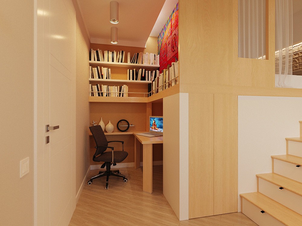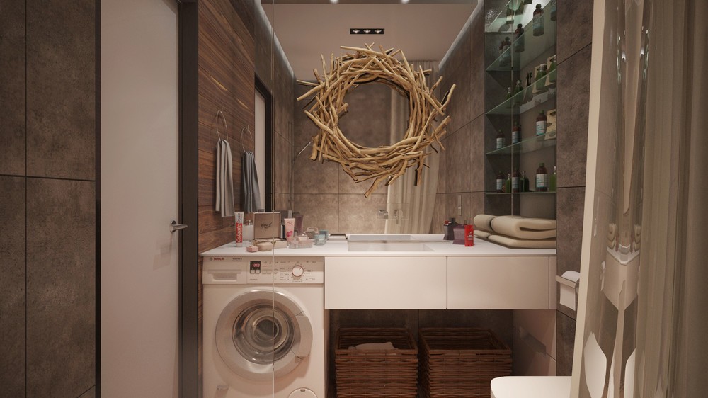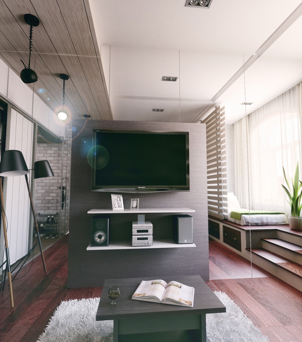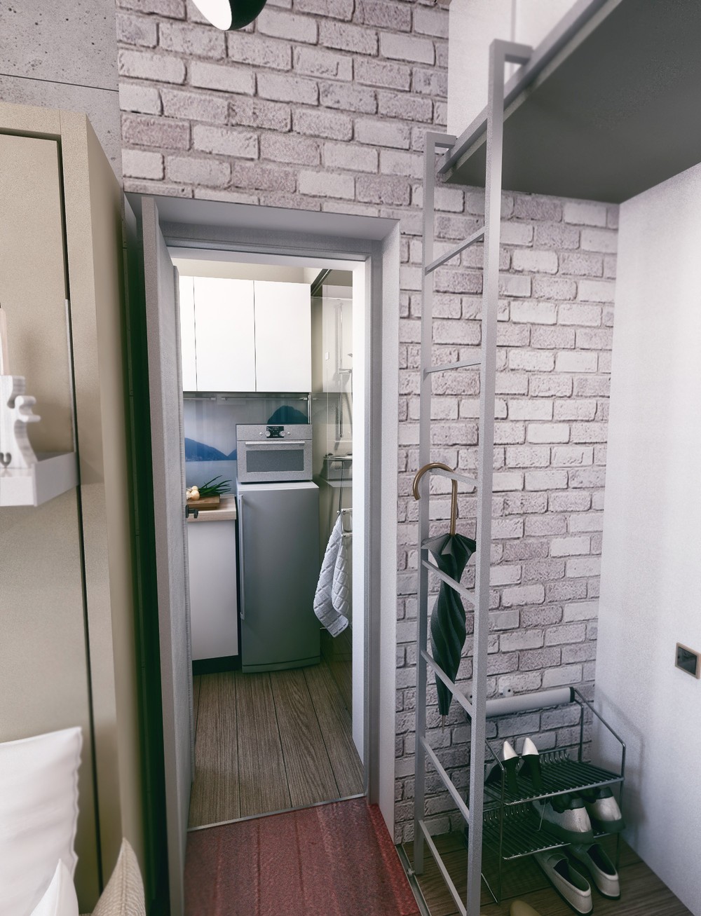 Our final compact home design is the work of Yulia Baranova, with a sweet and stylish home decorated in white and gray with abundant wood cladding. Bright teal accents demonstrate the flexibility of the design – how it could be decorated to fit any style. But perhaps the most impressive feature is the loft bed that takes advantage of the home's high ceilings, freeing up space for storage beneath.