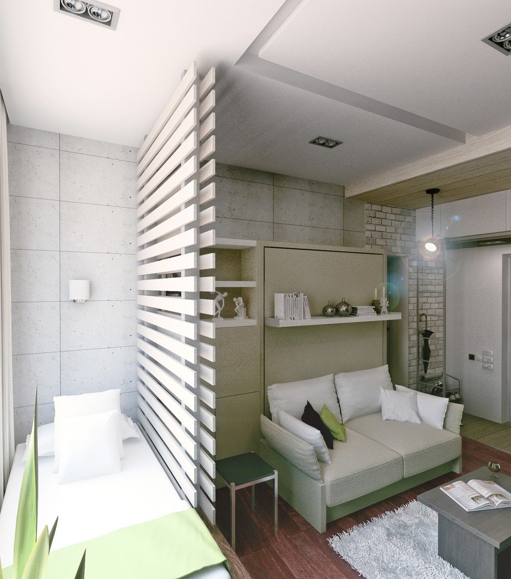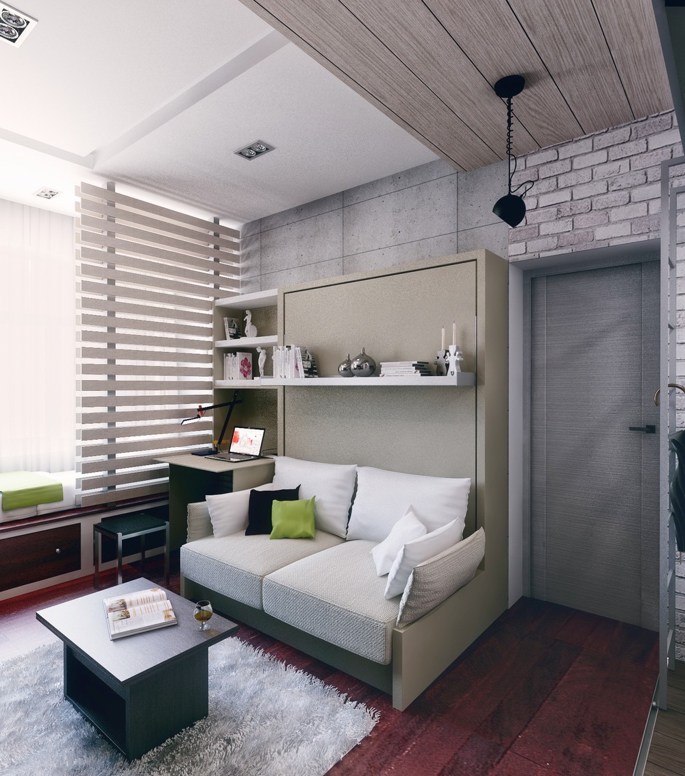 Now, let's take a look at some of the other bedroom configurations the designer visualized to see how flexible this interior really is. This one features sleek wooden paneling behind the sofa-bed, the same pattern used in the kitchen. Shelving surrounds the sofa on all sides.