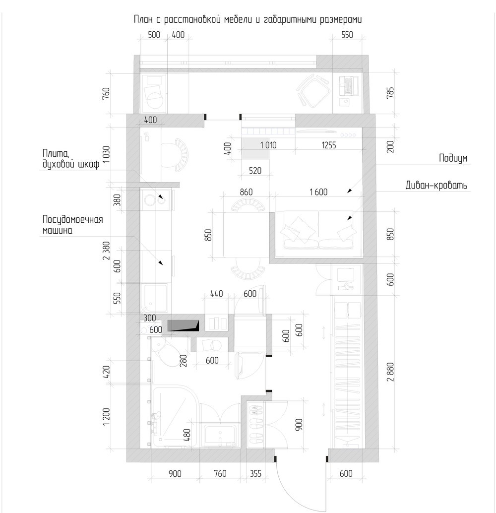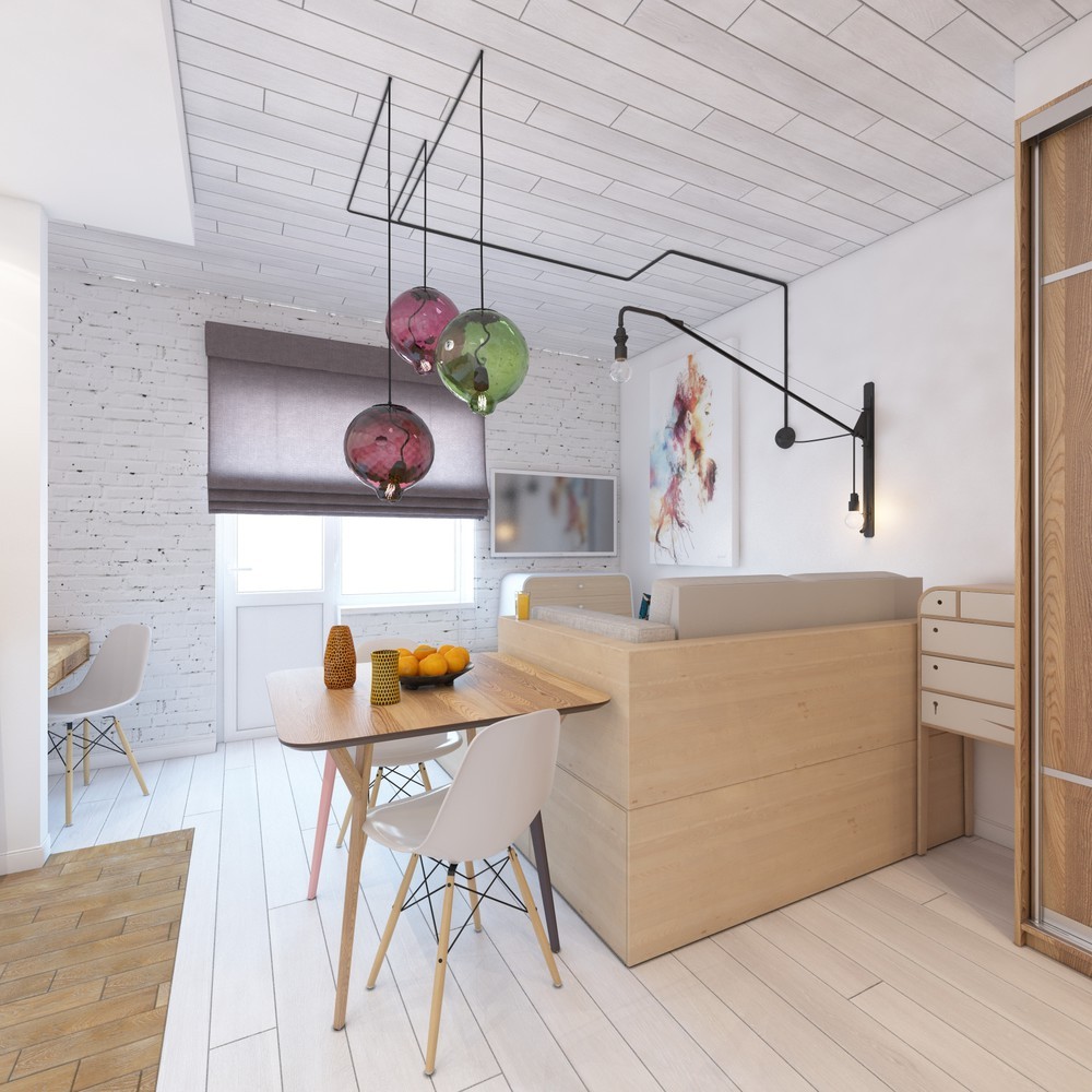 This home by Stanislav Aynulov takes a clever approach to space management by integrating dual-purpose furniture and storage wherever possible. Its 28 square meter interior looks simple and spacious – brightened by a colorful geometric rug and gem-toned dining pendant lights.