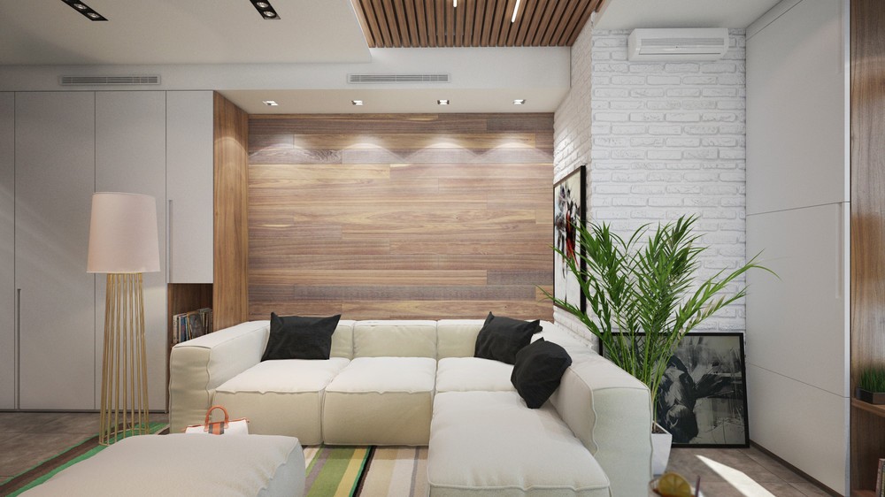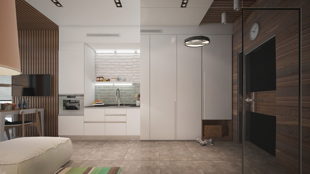 Olga Chekmaryov designed this small apartment within a new residential complex – to make the space attractive to renters, natural materials and neutral colors provide the interior with an appealing blank canvas suited to the needs of any future occupant. Warm textures and materials make it feel like home. This apartment is compact but certainly doesn't feel cramped.