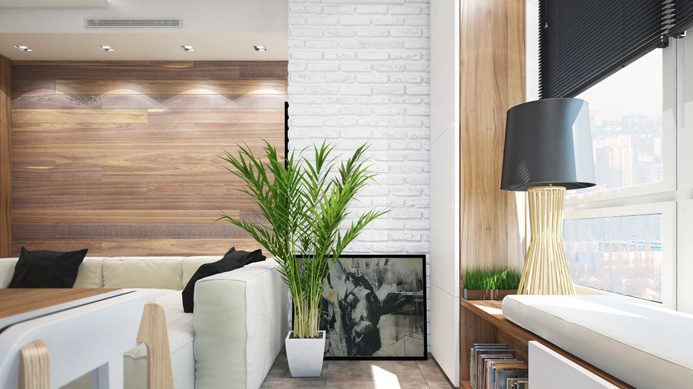 Painted white brick and warm wood cladding are perfectly in line with today's trends, but these classic materials never really go out of style. The Areca palm spotted here is one of the best indoor plants to have.